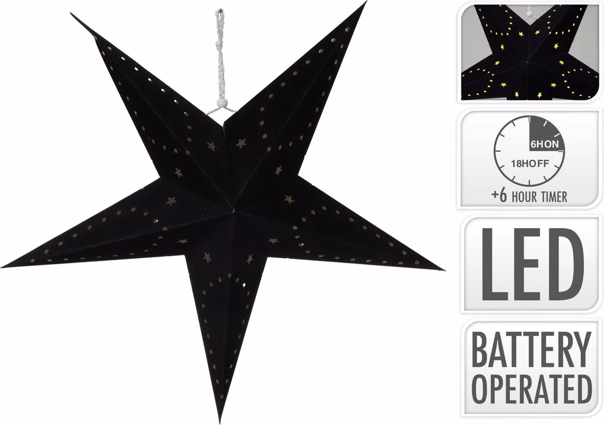 Verlichte papieren kerstster lampion zwart 60 cm op batterijen. Voeding: 2x AA batterijen (niet inbegrepen). Materiaal ster: papier. Geschikt voor binnen. Kleur licht: warm wit. Aantal lampjes: 10. Inclusief timer functie. Kerstversiering/kerstdecoratie kerststerren met verlichting/kerstverlichting.
