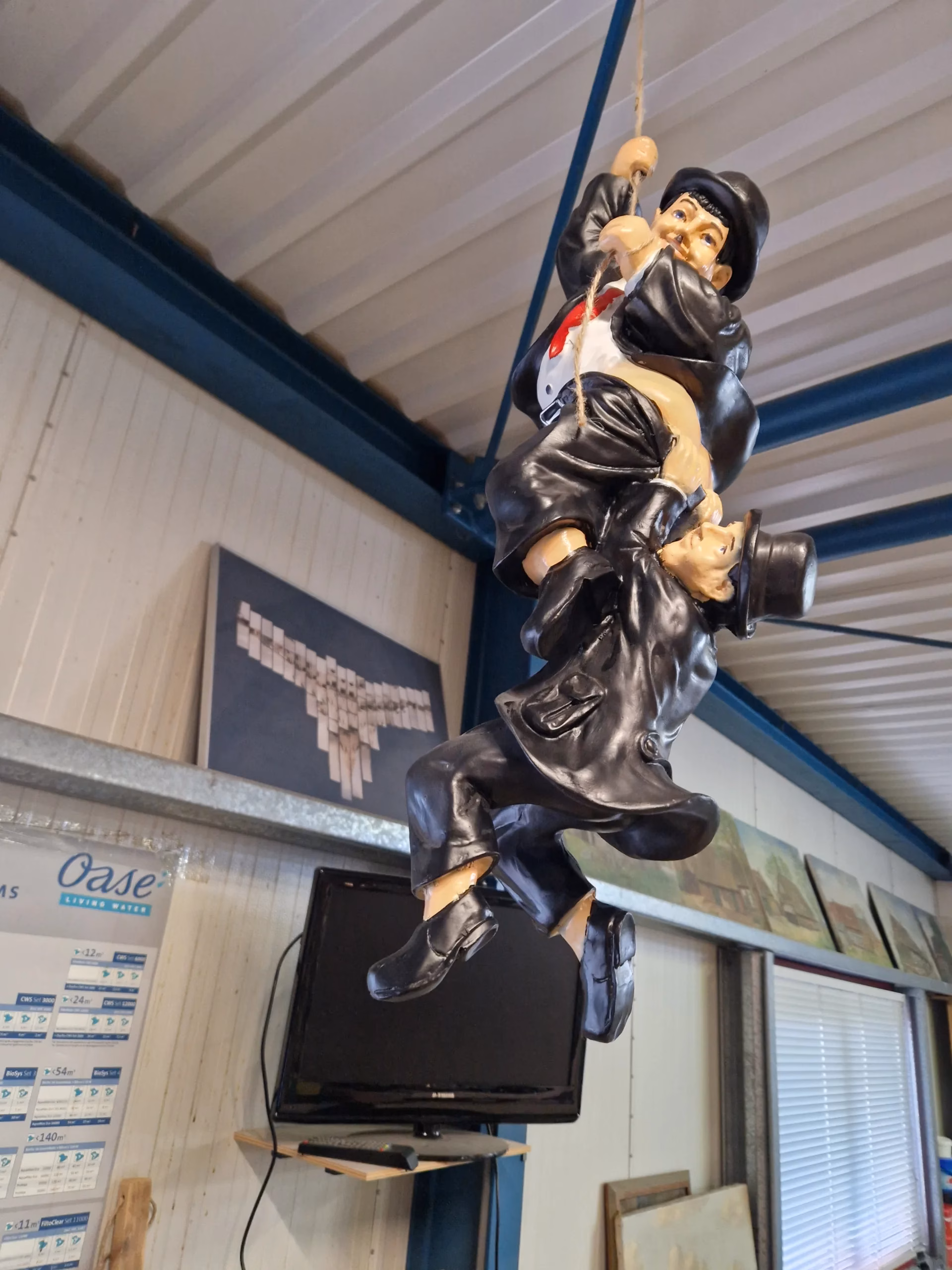 Breng een vleugje klassieke humor in huis met dit unieke beeld van het legendarische duo Laurel en Hardy. Het kunstwerk toont hen terwijl ze samen aan een touw omhoog klimmen, waarbij Laurel zich stevig vasthoudt aan de broek van Hardy– met een komisch resultaat: de broek zakt half af.