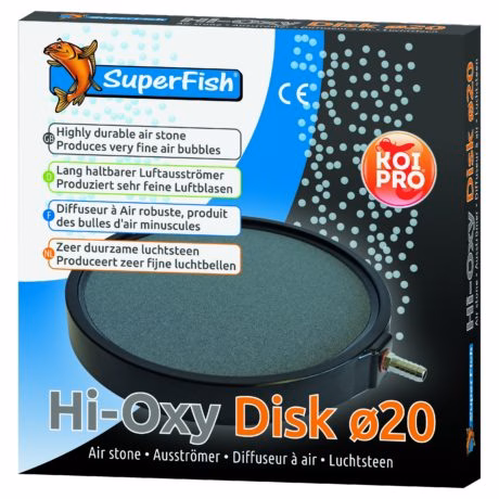 Deze Hi-Oxy Disk ronde luchtstenen van Superfish zijn gebakken bij hoge temperaturen. Hierdoor geven de stenen zeer fijne luchtbellen en gaan zij langer mee. De aansluiting op de steen is een 9 millimeter tule. De disk laat 10 tot 24 liter lucht door per minuut.