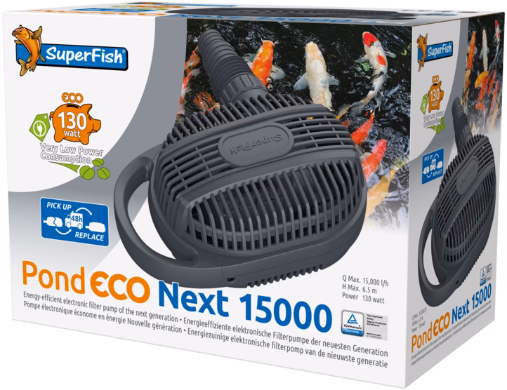 Een SuperFish Pond Eco Next vijverpomp is de zuinigste vijverpomp van Superfish. Perfect geschikt voor filtratie en om water bijvoorbeeld te verplaatsen naar beekloop of waterval. De nieuwe motortechniek zorgt voor het hoogst mogelijke rendement tegen een zo laag mogelijk energieverbruik. De nieuwe motor heeft goede prestaties en een zeer grote opvoerhoogte.