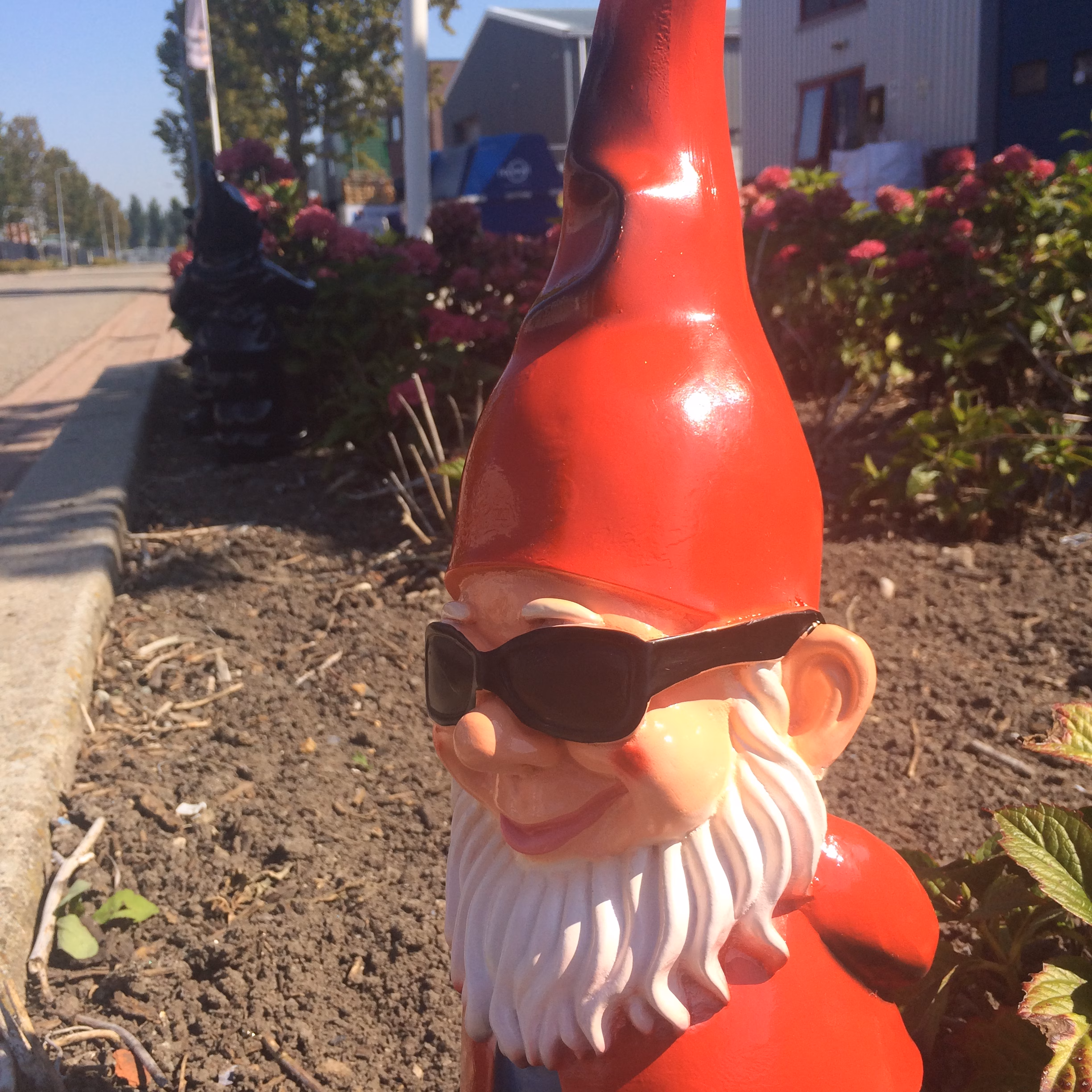 Tuinkabouter met zonnebril in originele kleuren.